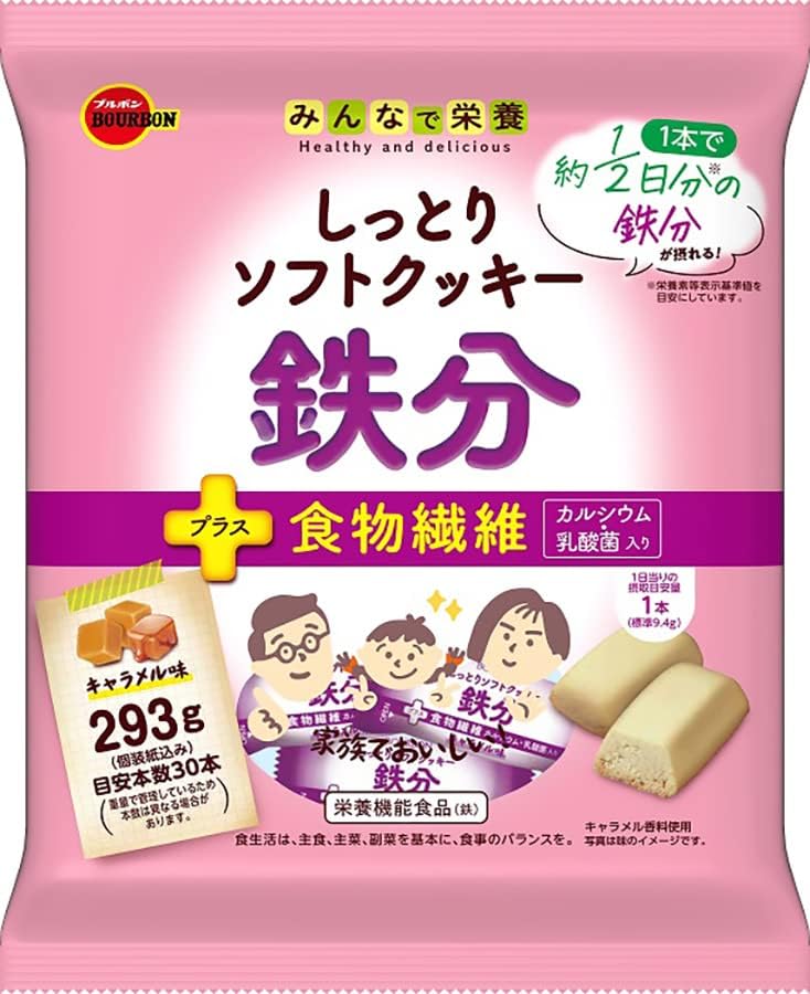 1本で、約半日分の鉄分(3.6mg )が摂れます。やさしいキャラメル味のソフトクッキーで、お子さまもおいしく食べられます。